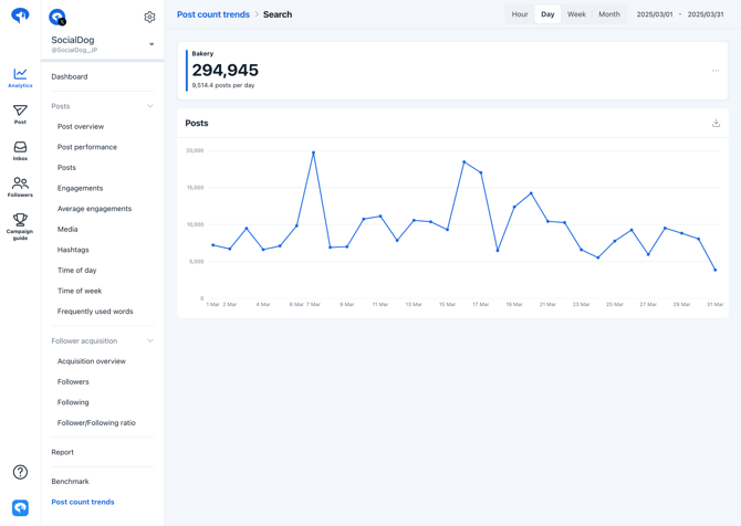 You can view post count trends containing the specified keyword by hour, day, week, or month. You can also set a custom date range for the analysis, allowing you to see trends from over a year ago.