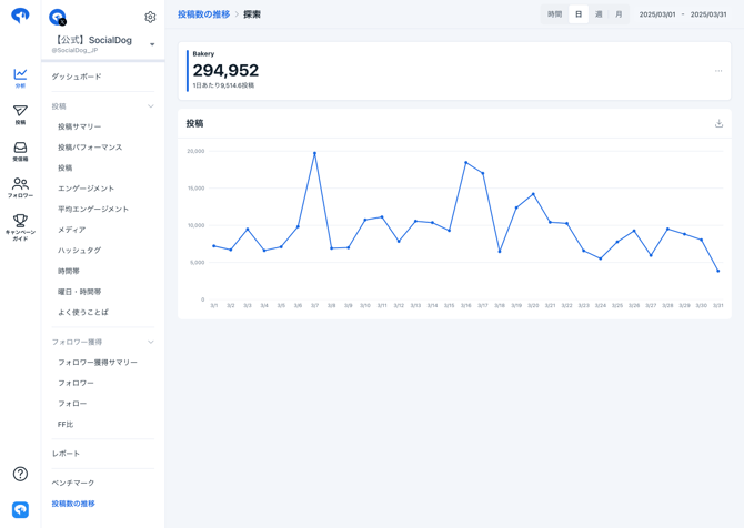 集計間隔は、「時間」「日」「週」「月」を選択できます。選択された集計間隔に基づいて平均投稿数が表示されます(「週」を選択すると、総投稿数の下に1週間あたりの投稿数が表示されます)。