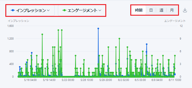グラフの分析項目はドロップダウンメニューで変更でき、最大2項目を同時表示できます。また、分析する日付範囲の変更や、時間、日、週、月ごとの数値確認も可能です。