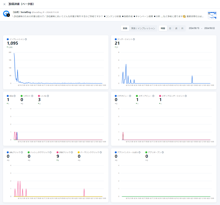 このページでは、選択した投稿のパフォーマンスがグラフ化され、ひと目で効果を把握できます。