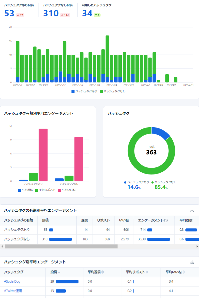 以下の例では、「ハッシュタグなし」より「ハッシュタグあり」の投稿の方がエンゲージメントが高いことがわかります。また、「ハッシュタグあり」の場合、「ハッシュタグ別平均エンゲージメント」で、どのハッシュタグが最も効果的かを確認できます。